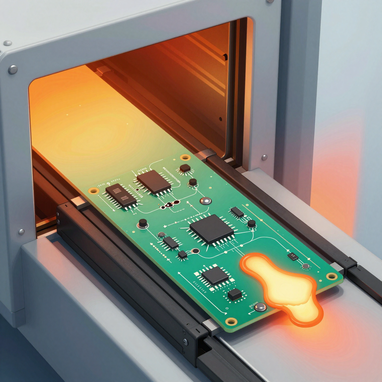 After all surface-mount components are placed, the PCB enters the reflow oven. Here, the board is gradually heated through several temperature zones: