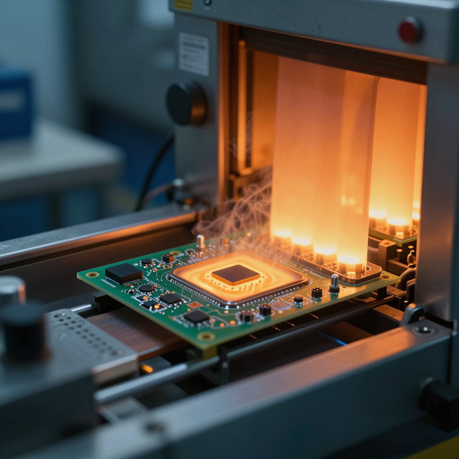 Etter komponentplassering går kortet inn i en reflow-ovn. Her varmes det gradvis opp i henhold til en spesifikk termisk profil, som smelter loddepastaen og danner permanente elektriske og mekaniske forbindelser. Kjølefasen størkner skjøtene, og fullfører SMT-delen av elektronikkmonteringen.